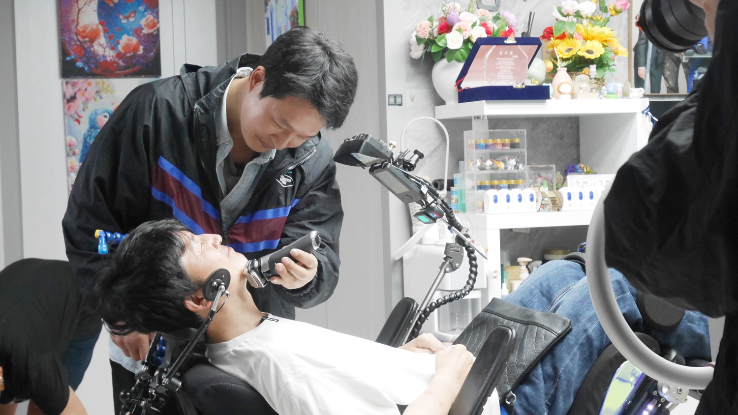 배우 이성우가 사지마비 장애인 이원준 씨의 면도를 돕고 있다.