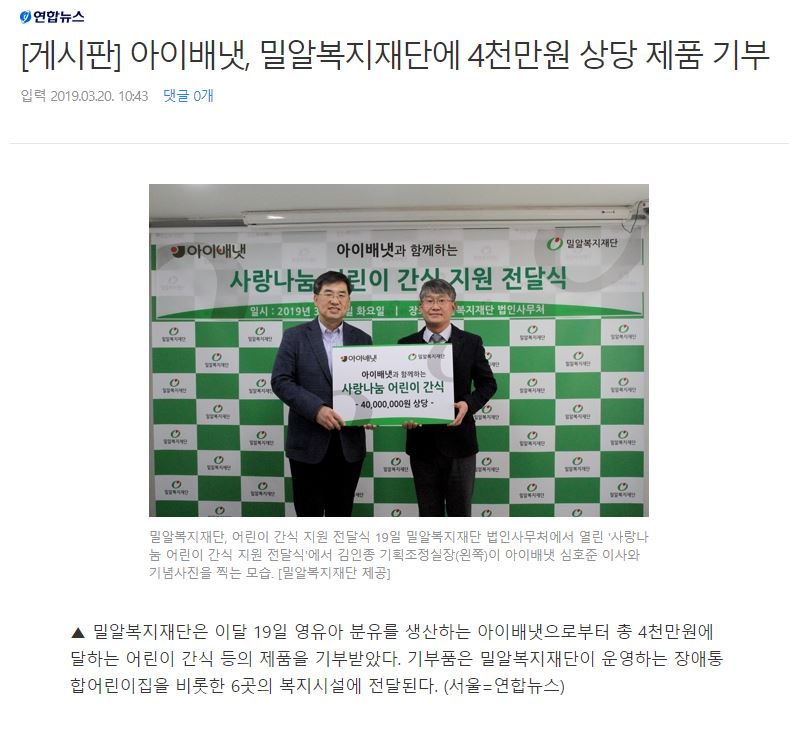 [연합뉴스] 아이배냇, 밀알복지재단에 4천만원 상당 제품 기부