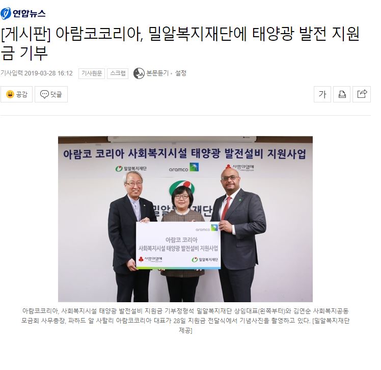 [연합뉴스] 아람코코리아, 밀알복지재단에 태양광 발전 지원금 기부