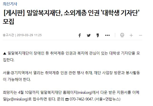 [연합뉴스, 한겨레 외] 밀알복지재단, 대학생 기자단 모집