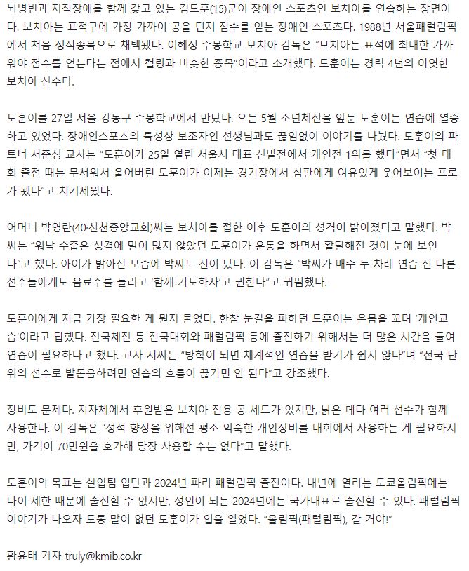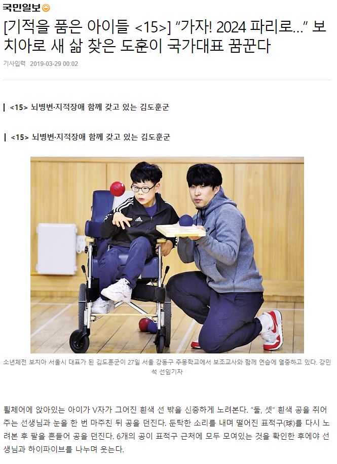 [국민일보] [기적을 품은 아이들 <15>] “가자! 2024 파리로…” 보치아로 새 삶 찾은 도훈이 국가대표 꿈꾼다