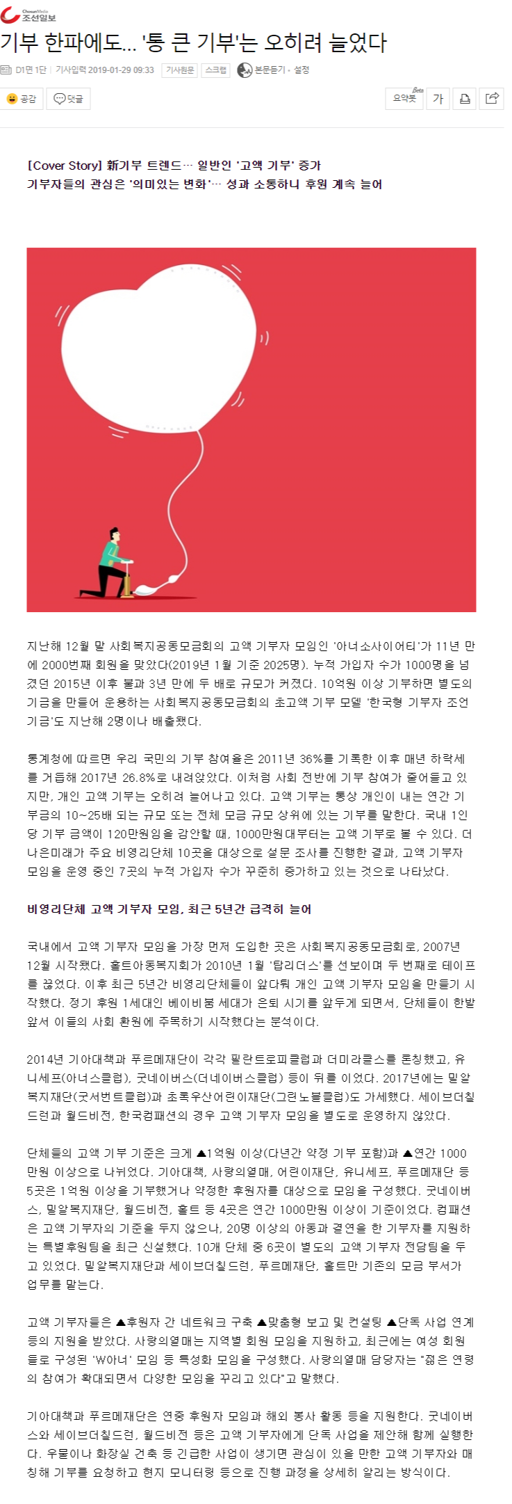 [조선일보 더나은미래] 기부 한파에도… '통 큰 기부'는 오히려 늘었다