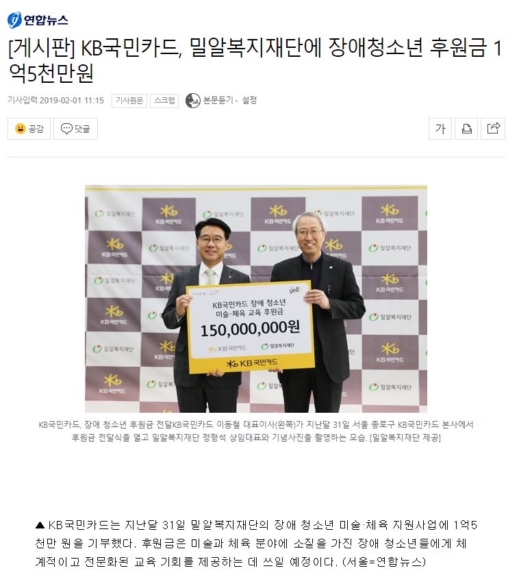 [연합뉴스] [게시판] KB국민카드, 밀알복지재단에 장애청소년 후원금 1억5천만원