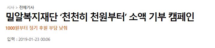 [국민일보] 밀알복지재단 '천천히 천원부터' 소액 기부 캠페인[크리스챤연합신문] 밀알복지재단, 소액기부 캠페인 ‘천천히 천원부터’ 진행