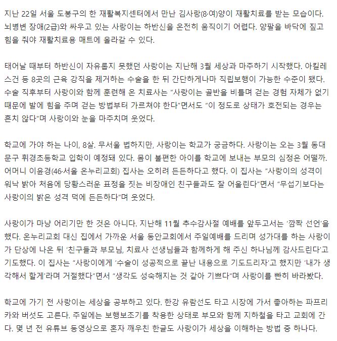 [국민일보] [기적을 품은 아이들 <13>] 수술 받고 직립보행으로 한걸음 떼… “3월에 학교 가요”