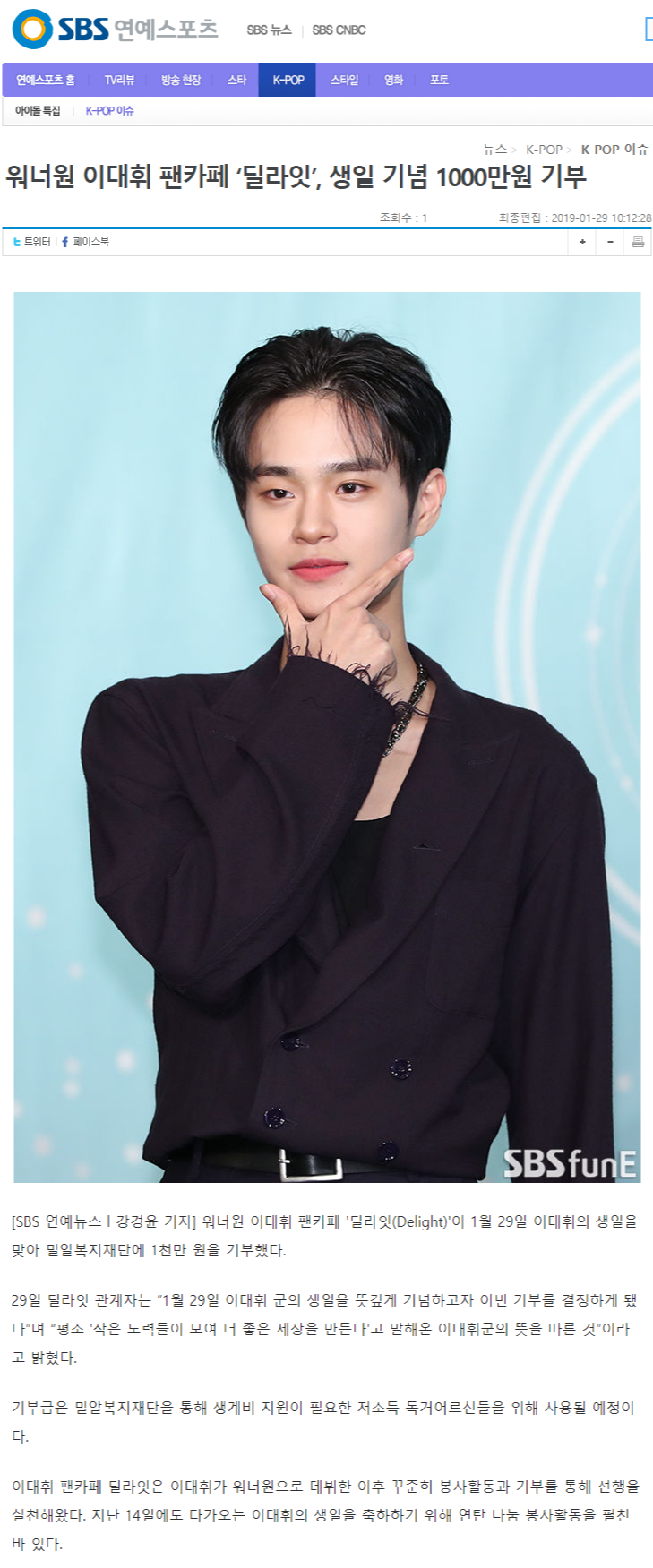 [SBS] 워너원 이대휘 팬카페 ‘딜라잇’, 생일 기념 1000만원 기부