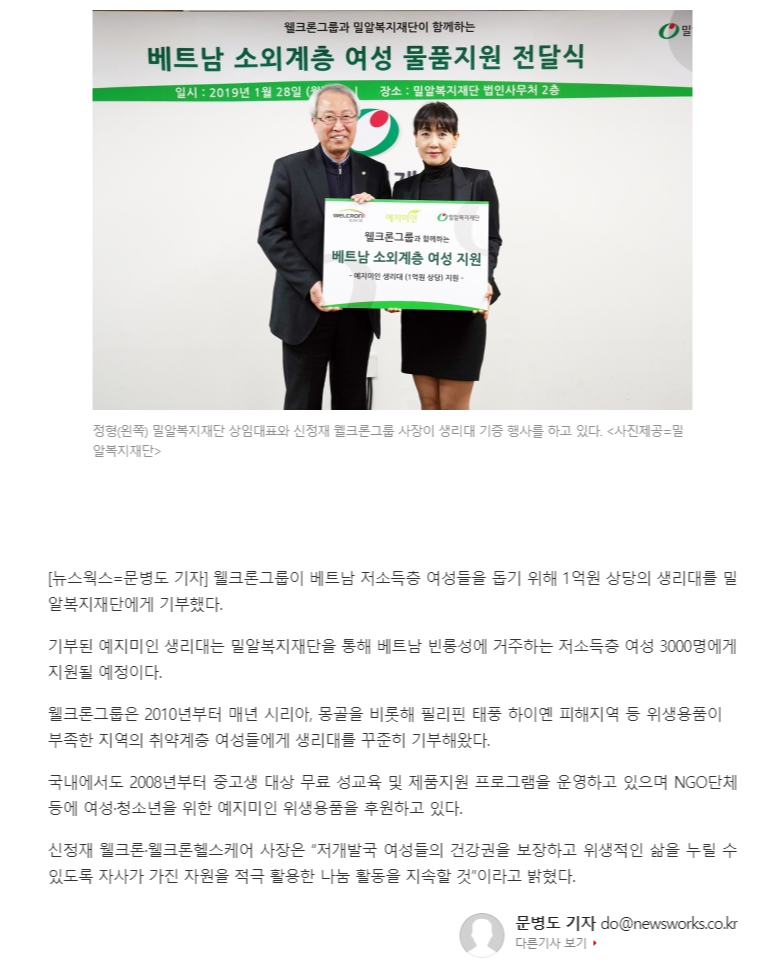 [뉴스웍스] 웰크론그룹, 밀알복지재단에 1억 원 상당 '예지미인' 생리대 기부...