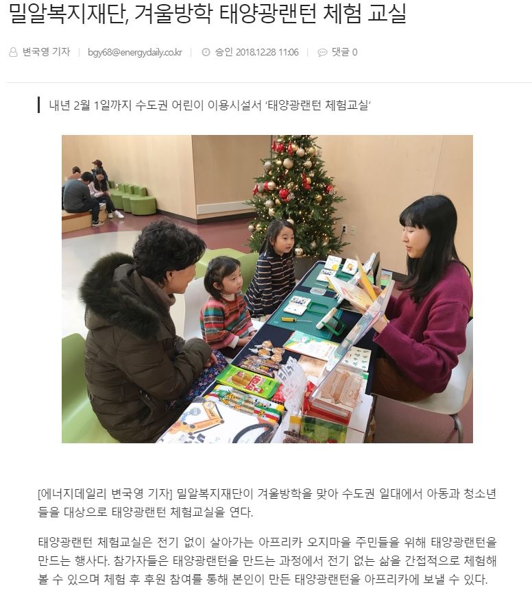 [에너지데일리] 밀알복지재단, 겨울방학 태양광랜턴 체험 교실