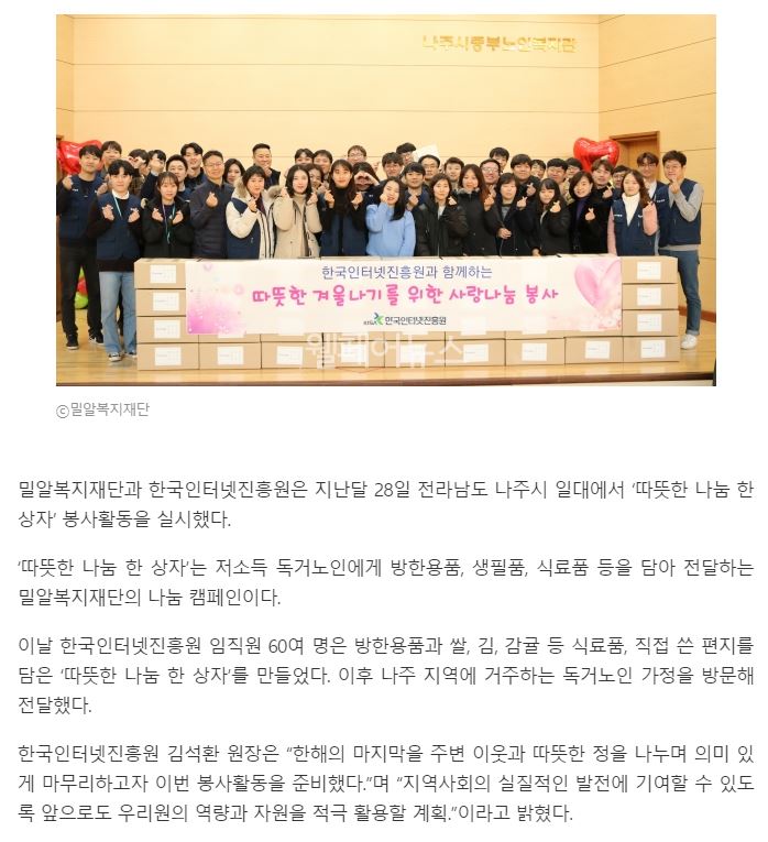[녹색경제] 인터넷진흥원, 밀알복지재단과 나주 지역 홀몸 어르신 대상 '나눔 봉사'로 한해 마무리