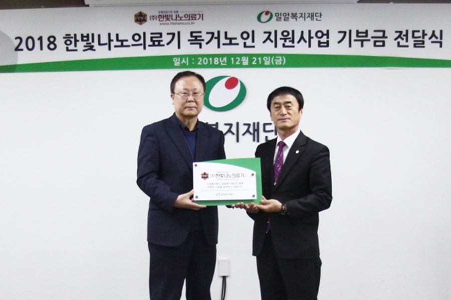 한빛나노의료기, 독거노인 지원 위해 밀알복지재단에 기부금 전달