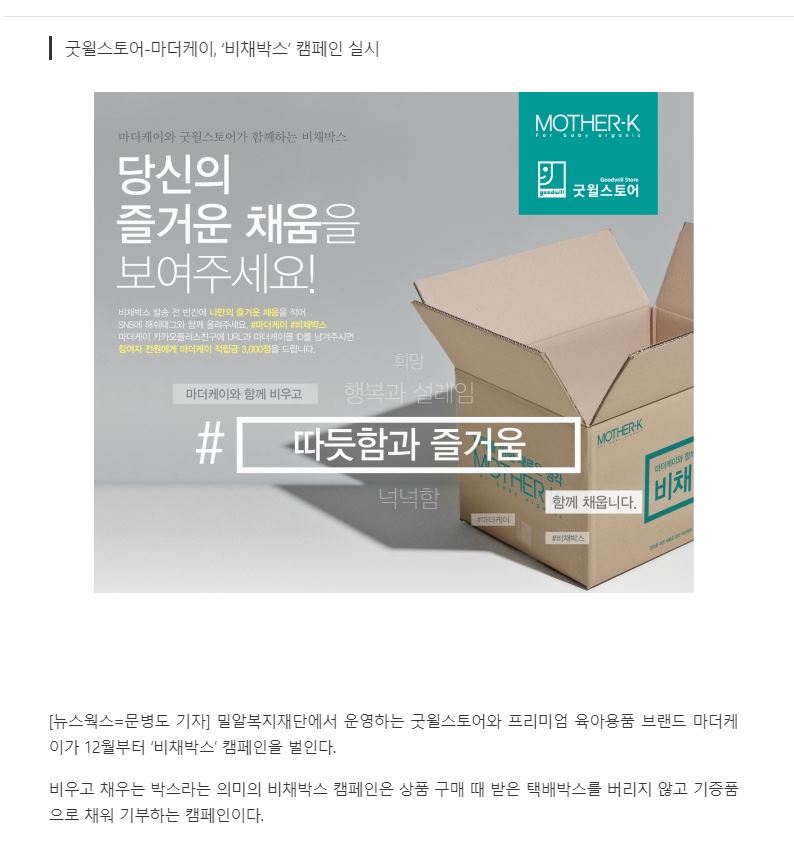 [우먼컨슈머] 굿윌스토어-마더케이, ‘비채박스’ 캠페인 진행