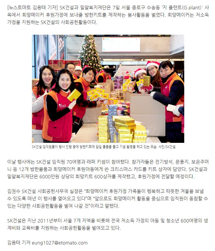 [뉴데일리] "따뜻한 겨울 나세요" SK건설, 저소득가정에 방한키트 전달