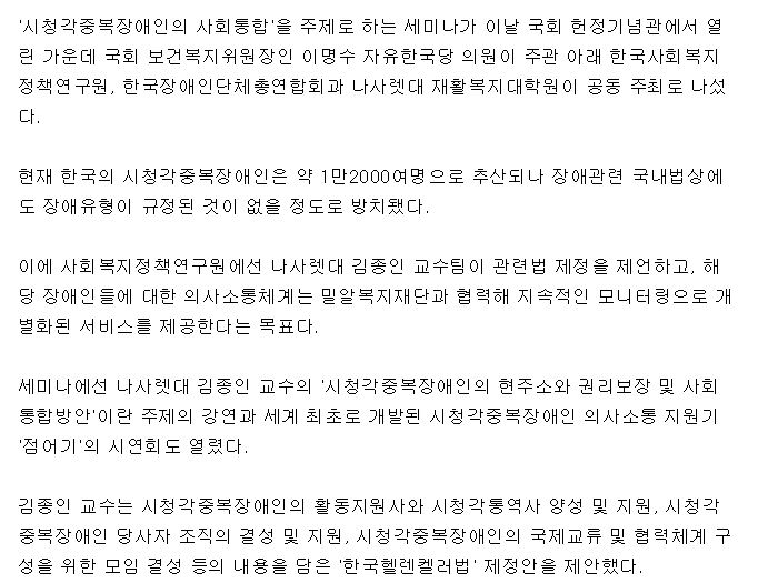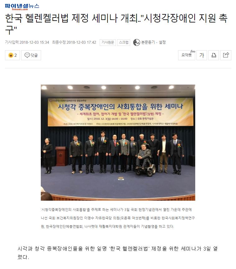 [국민일보] 시청각 중복장애인 위한 ‘한국 헬렌컬러법안’ 제정 공청회[국민일보] [일터 단신] 시청각 중복장애인 복지사각 해소, 한국판 ‘헬렌켈러법’ 제정 ...