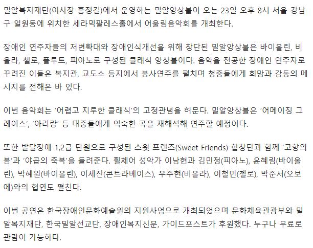 [복지연합신문] 장애인 연주자로 구성된 밀알앙상블, 어울림음악회