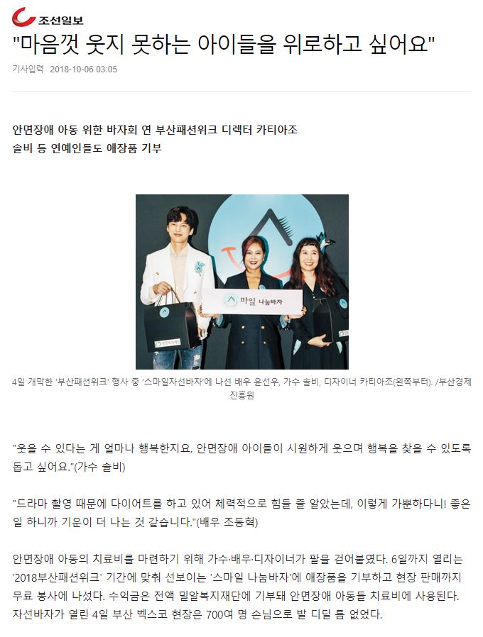 [아시아일보] 솔비-조동혁-윤선우, 안면장애아동 위한 ‘스마일나눔바자’ 참여
