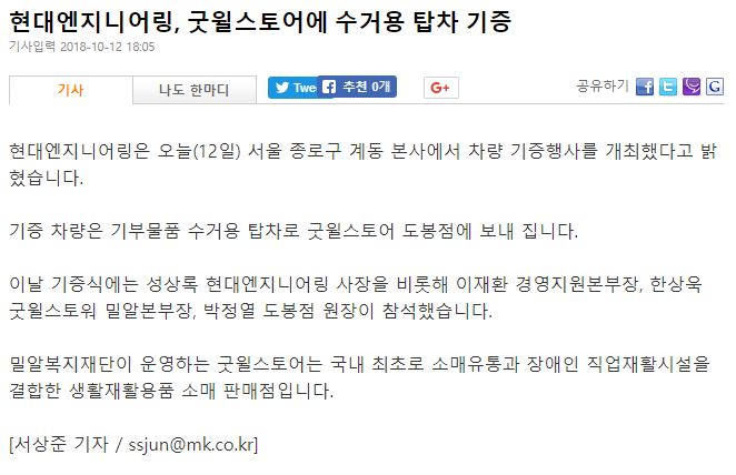 [매일경제] 현대엔지니어링, 굿윌스토어에 기부물품 수거용 탑차 기증