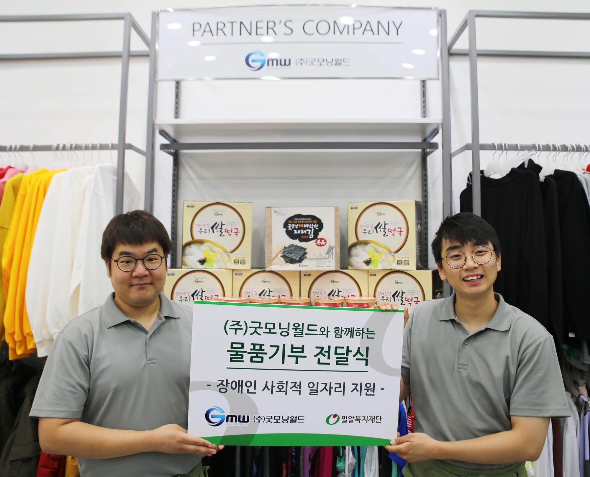 이번 전달식에서 (주)굿모닝월드는 1100만원 상당의 ‘엄마손길 우리 쌀 떡국’과 ‘실큐 THE 바삭한 재래김’을 밀알복지재단에 전달했다.