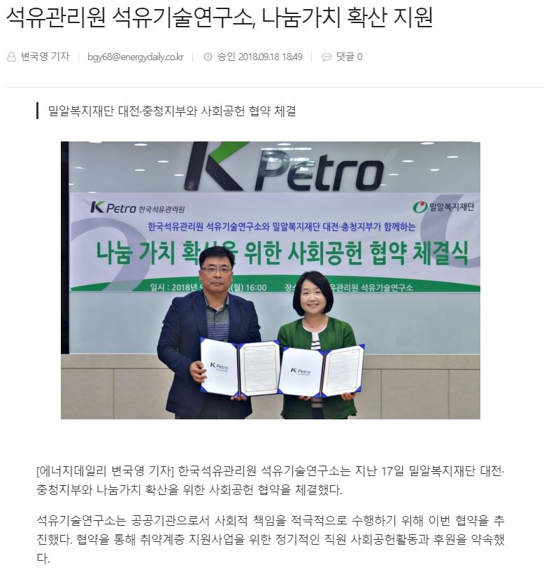[에너지데일리] 석유관리원 석유기술연구소, 나눔가치 확산 지원
