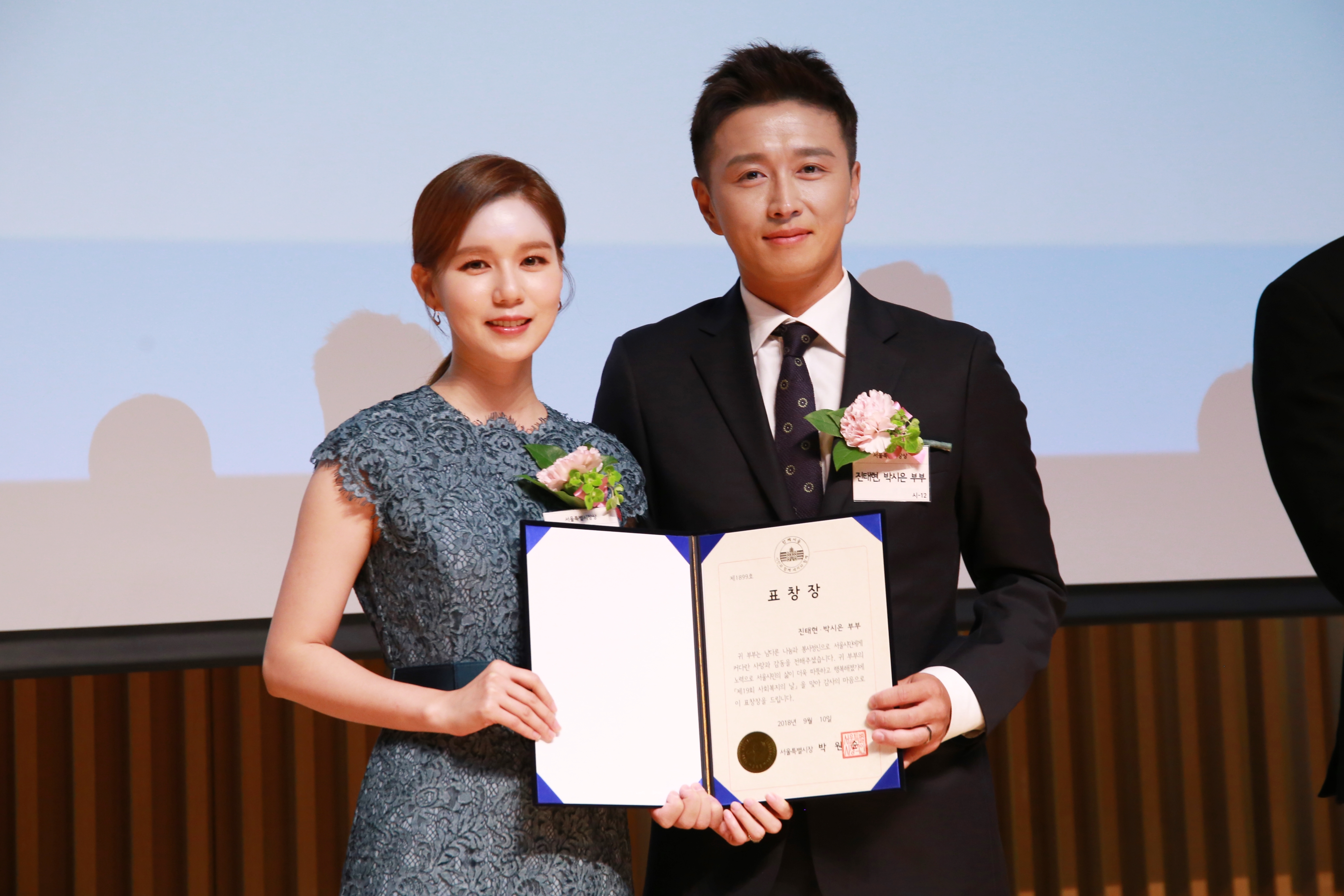 배우 박시은-진태현 부부가 10일(월) 서울시청에서 열린 제19회 사회복지의 날 기념 ‘2018 서울사회복지대회’에서 서울특별시장상을 수상했다.