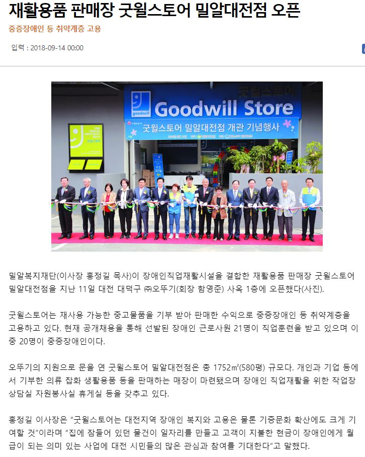 [조선일보] [더나은미래] 밀알복지재단, 오뚜기 대전사옥에 ‘굿윌스토어 밀알대전점 오픈
