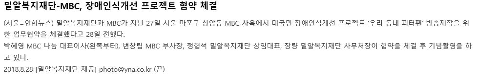 [MBC 뉴스] MBC-밀알복지재단, '우리동네 피터팬' 방송제작 협약체결[MBC 연예] MBC-밀알복지재단, 장애인식개선 프로젝트 '우리동네 피터팬' 방송제작 협약체결[크리스천투데이] MBC-밀알복지재단, <우리동네 피터팬> 방송제작 협약체결[에이블뉴스] MBC-밀알복지재단, 장애인식개선 프로젝트 방송제작 협약 [기독인뉴스] 밀알복지재단과 MBC방송 우리동네 피터팬 협약식 열려[복지연합신문] MBC-밀알복지재단, 장애인식개선 프로젝트 '우리동네 피터팬' 방송제작 협약 체결[뉴스타운] 밀알복지재단, MBC와 방송제작 협약 체결