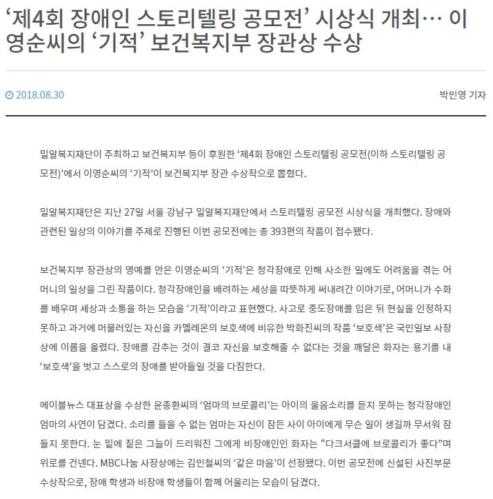 [조선일보][더나은미래] ‘제4회 장애인 스토리텔링 공모전’ 시상식 개최… 이영순씨의 ‘기적’ 보건복지부 장관상 수상