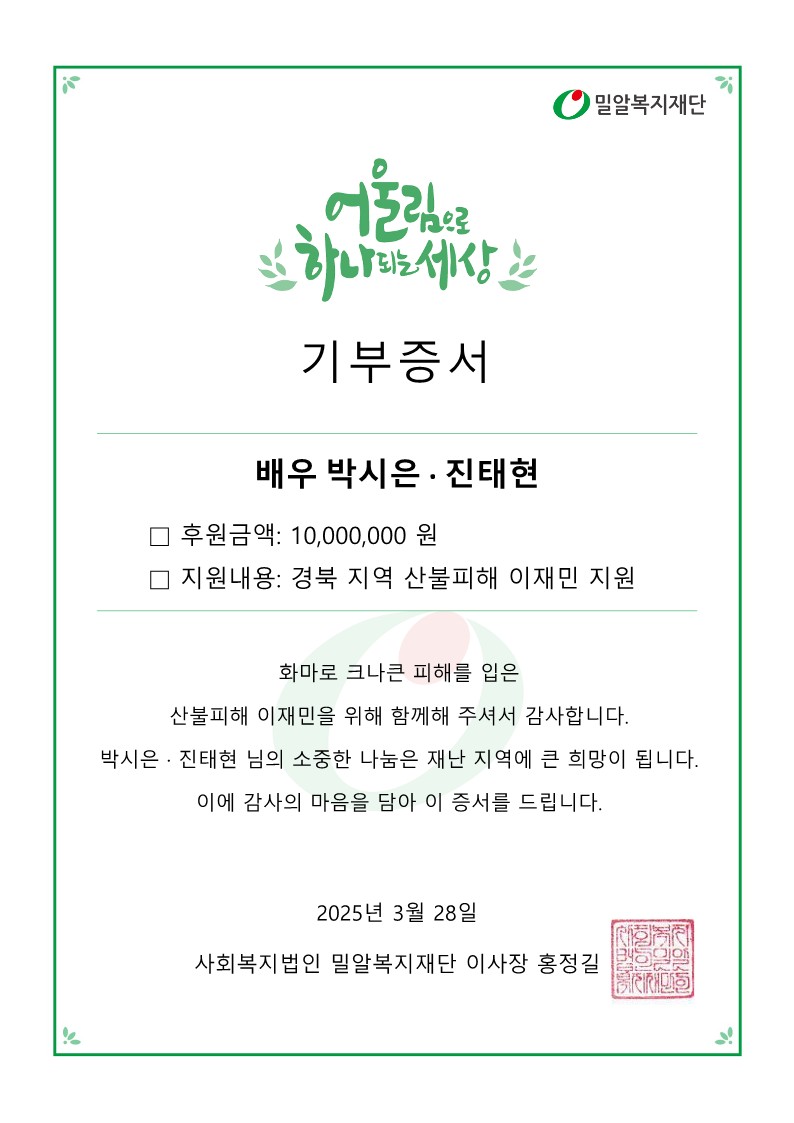 손길을 보태주신 진태현-박시은 부부에게 감사드린다”며, “밀알복지재단은 피해 지역 이재민들이 하루 빨리 일상을 회복할 수 있도록 최선을 다하겠다”고 밝혔다.