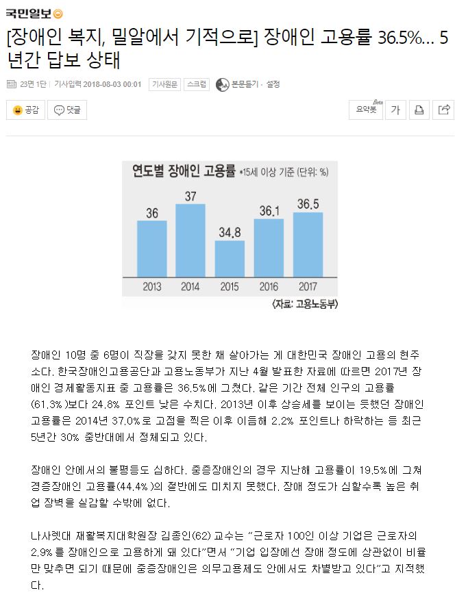 [국민일보] [장애인 복지, 밀알에서 기적으로] 장애인 고용률 36.5%… 5년간 답보 상태