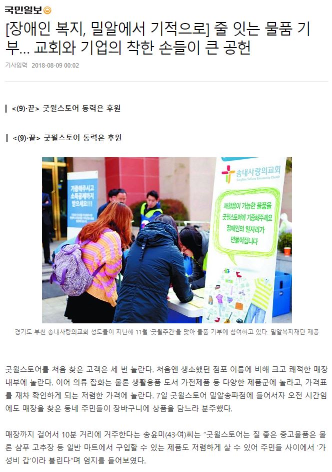 [국민일보] [장애인 복지, 밀알에서 기적으로] 줄 잇는 물품 기부… 교회와 기업의 착한 손들이 큰 공헌