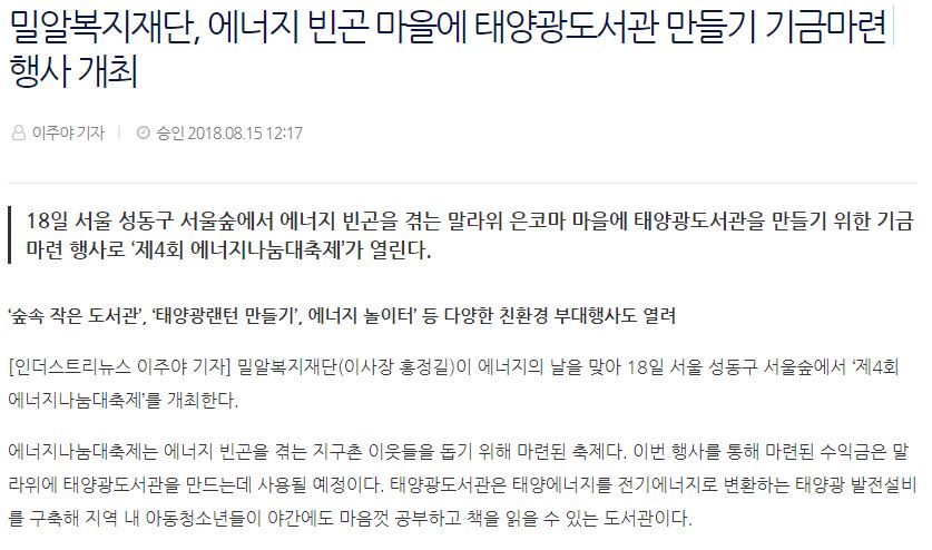 [인더스트리뉴스] 밀알복지재단, 에너지 빈곤 마을에 태양광도서관 만들기 기금마련 행사 개최
