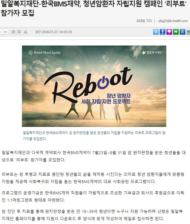 [약사공론] 한국BMS-밀알복지재단, 암환자 자립 프로그램 '리부트' 진행