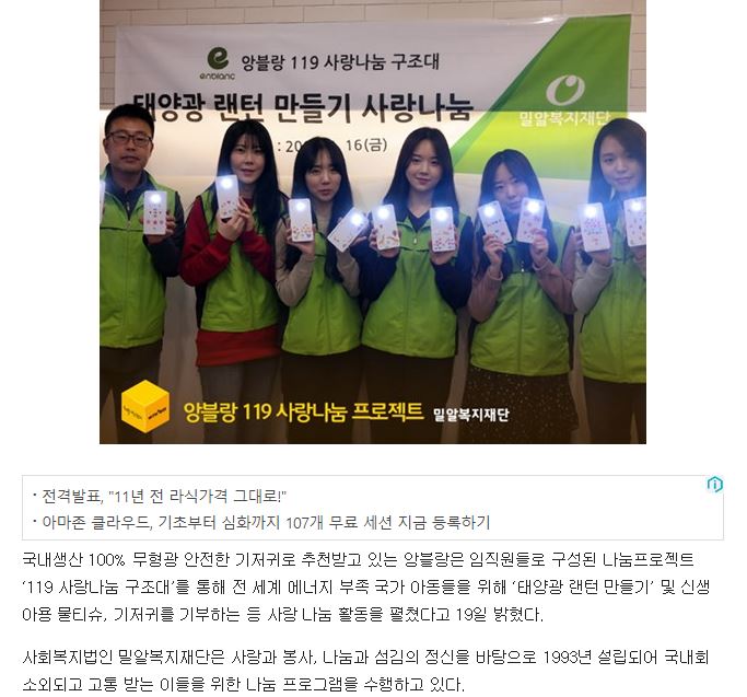 [베이비뉴스] 앙블랑 아기물티슈, 빈곤국 아동을 위한 ‘태양광랜턴’ 제작