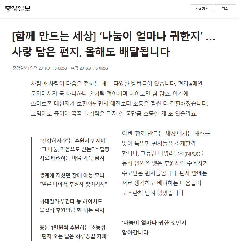 [함께 만드는 세상] ‘나눔이 얼마나 귀한지’ … 사랑 담은 편지, 올해도 배달됩니다 <중앙일보 기사보기>