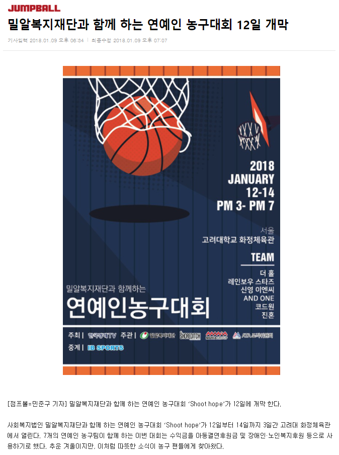 [점프볼 외 10건] 밀알복지재단과 함께 하는 연예인 농구대회 12일 개막