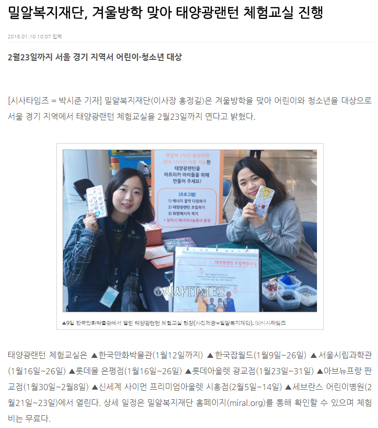 [시사타임즈 외 8건] 밀알복지재단, 겨울방학 맞아 태양광랜턴 체험교실 진행