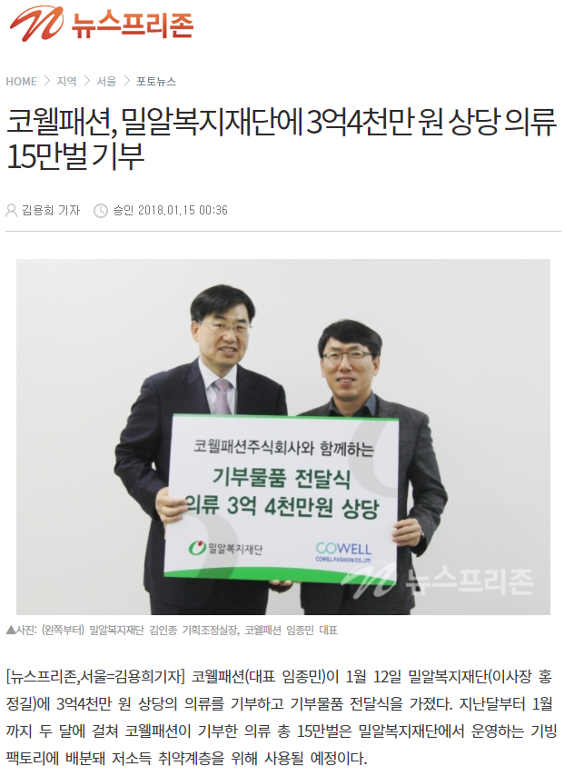 코웰패션, 밀알복지재단에 3억4천만 원 상당 의류 15만벌 기부 <뉴스프리존 기사보기>
