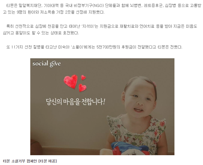 [연합뉴스 외 14건] 티몬, ‘소셜기부’로 환아, 불우아동 12명 지원