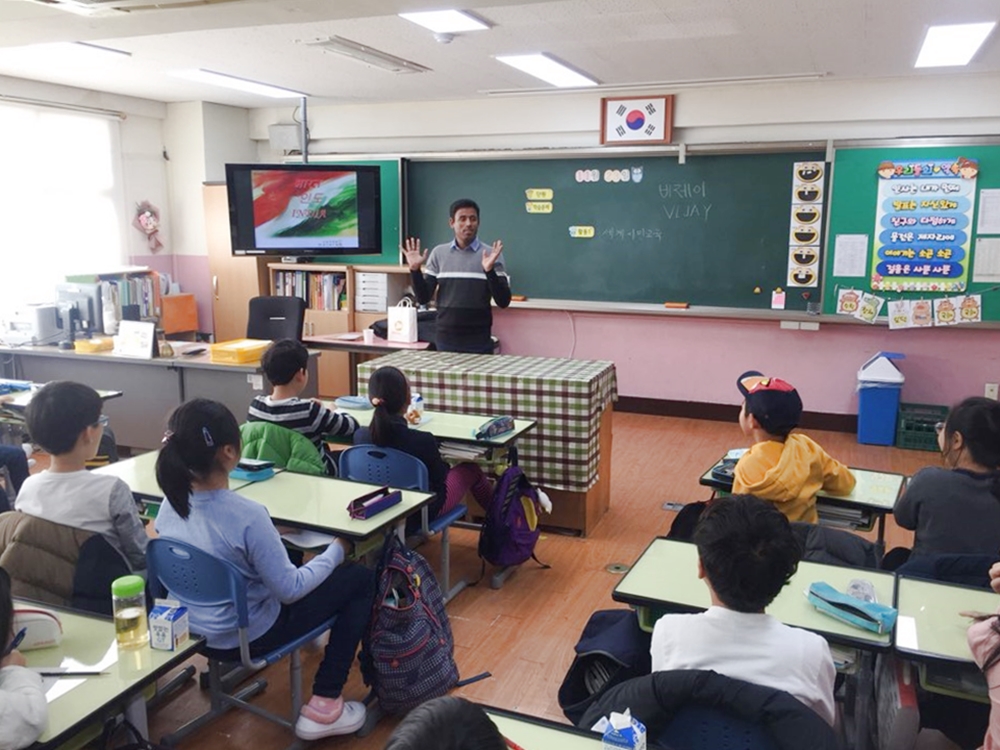 사진1. 지난 11월 인도인 유학생 비제이씨가 '찾아가는 세계문화 이해교육'을 진행하고 있다.