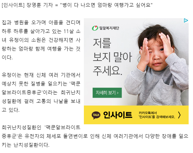 [인사이트] "희귀난치성에 걸려 고통의 나날을 보내고 있는 11살 유정이를 도와주세요"