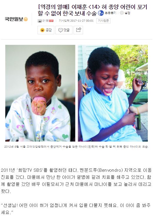 [국민일보] [역경의 열매] 이재훈 <14> 혀 종양 어린이 포기할 수 없어 한국 보내 수술