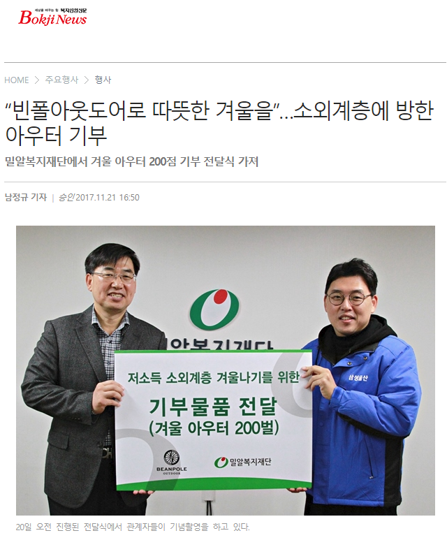 [복지연합신문] “빈폴아웃도어로 따뜻한 겨울을”…소외계층에 방한아우터 기부