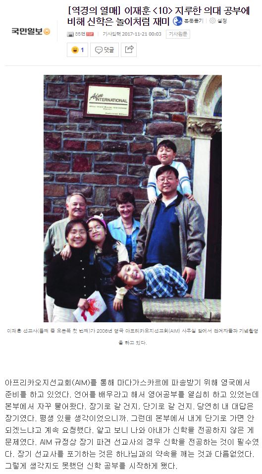[국민일보] [역경의 열매] 이재훈 <10> 지루한 의대 공부에 비해 신학은 놀이처럼 재미