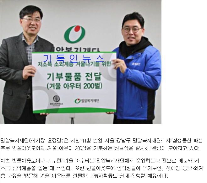 [기독인뉴스] 빈폴아웃도어 200점 밀알복지재단에 기부해