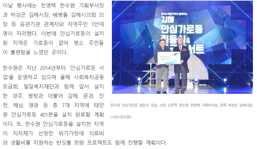 [KNS뉴스통신] ‘한수원 안심가로등’, 가야의 땅 김해 밝혀