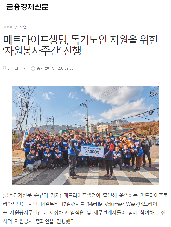 [금융경제신문] 메트라이프생명, 독거노인 지원을 위한 ‘자원봉사주간’ 진행