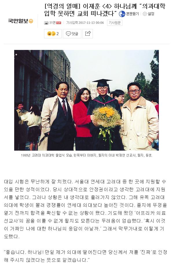 [국민일보] [역경의 열매] 이재훈 <4> 하나님께 “의과대학 입학 못하면 교회 떠나겠다”