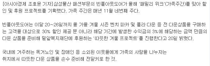 [아시아경제] 빈폴아웃도어 "옷도 사고 사랑도 전하세요"