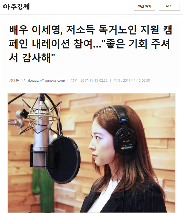[아주경제] 배우 이세영, 저소득 독거노인 지원 캠페인 내레이션 참여…"좋은 기회 주셔서 감사해"