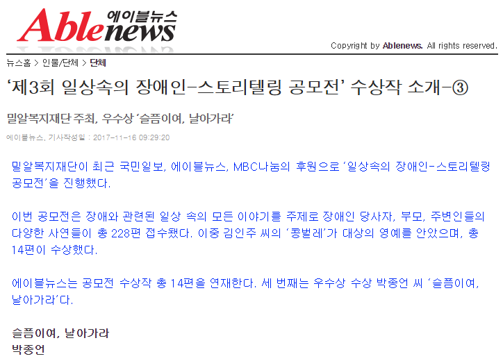 [에이블뉴스] ‘제3회 일상속의 장애인-스토리텔링 공모전’ 수상작 소개-③