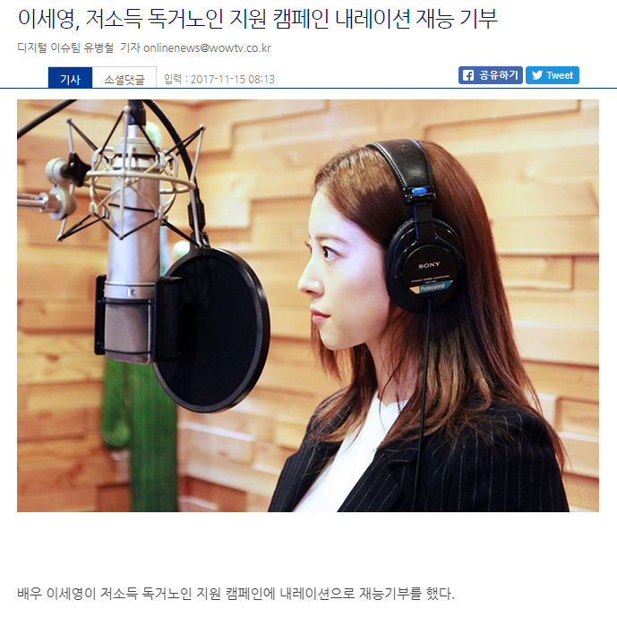 이전 [조이뉴스24] 이세영, 저소득 독거노인 지원캠페인 내레이션 재능기부 다음 [오센] '마음도 예쁜' 이세영, 저소득 독거노인 위해 내레이션 재능기부